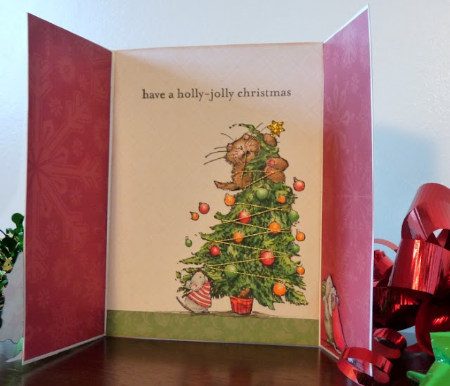 On the inside of the left flap I added the little mouse bringing a present to put under the tree.